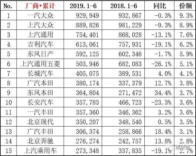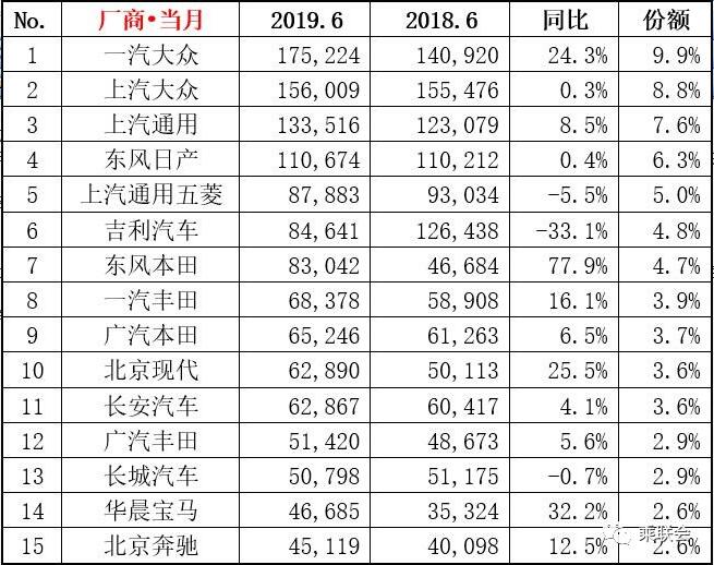 在6月的综合销量排名中,一汽大众一举夺魁,上汽大众和上汽通用分列第二、三位。今年以来,东风日产进步有目共睹,5、6月稳列榜单的第4名;东风本田、华晨宝马、北京现代分别是本月销量增长率的前三名。