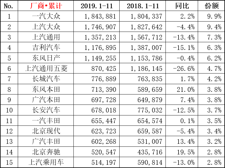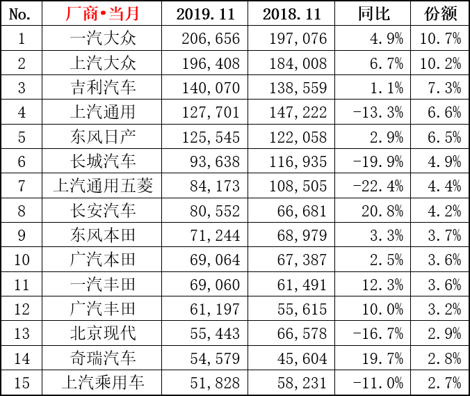 11月,从厂商排行来看,一汽大众和上汽大众仍是月度零售量冠亚军,市场份额双双超过10%;吉利汽车晋级为本月销量季军;上汽通用和东风日产仅两千辆之差分别居第四、第五位。本月长安汽车急起直追,成为入榜企业中增长率最高的企业(20.8%),奇瑞汽车退居其次(19.7%),五家日系车企均有不同程度的增长。