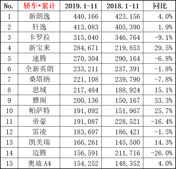 据中国汽车流通协会汽车市场研究分会(乘联会)最新综合销量数据统计显示,11月份国内狭义乘用车市场销量达193.7万辆,同比下降4.1%,环比增长5.1%,1-11月累计销量达1856.3万辆,同比下降7.9%。