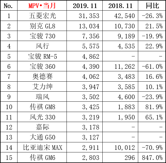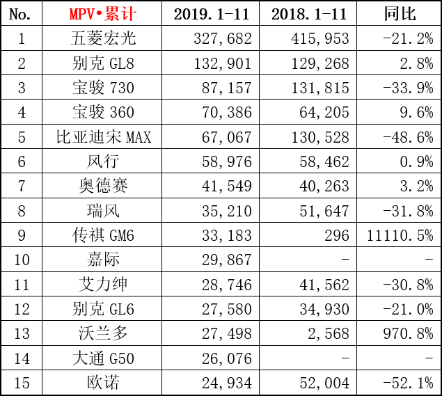 - 11月份MPV销量11.6万辆,同比下降16.5%,环比下降1.9%;1-11月累计销量124.0万辆,同比下降18.5%。