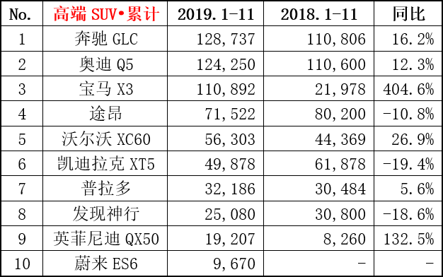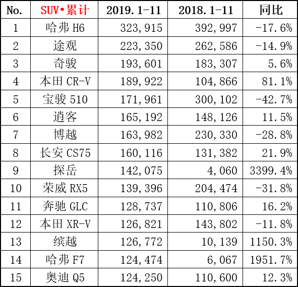 - 11月份SUV销量88.8万辆,同比增长3.7%,环比增长4.1%;1-11月累计销量819.3万辆,同比下降4.3%。