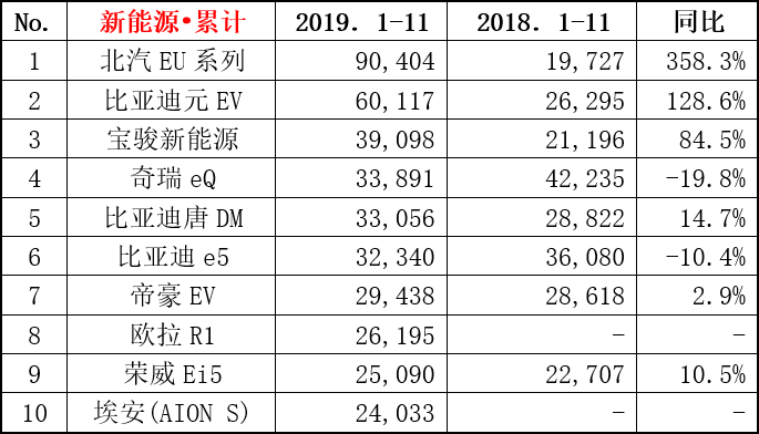 - 11月份新能源狭义乘用车销量7.2万辆,同比下降45.4%,环比增长13.8%;1-11月累计销量89.5万辆,同比增长6.9%,累计增长率明显稀释。