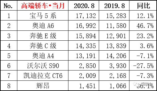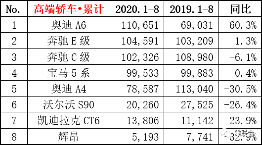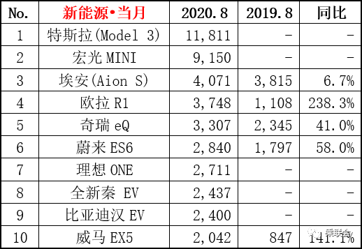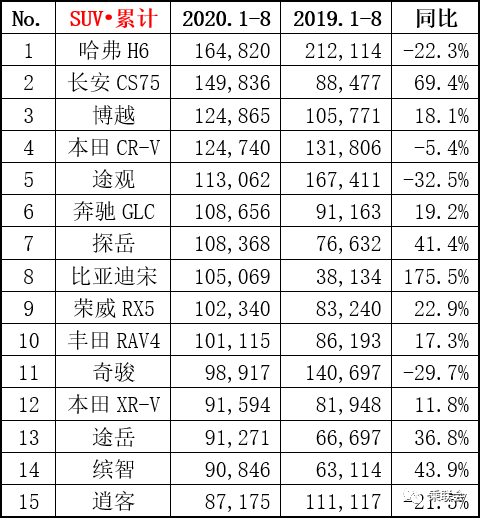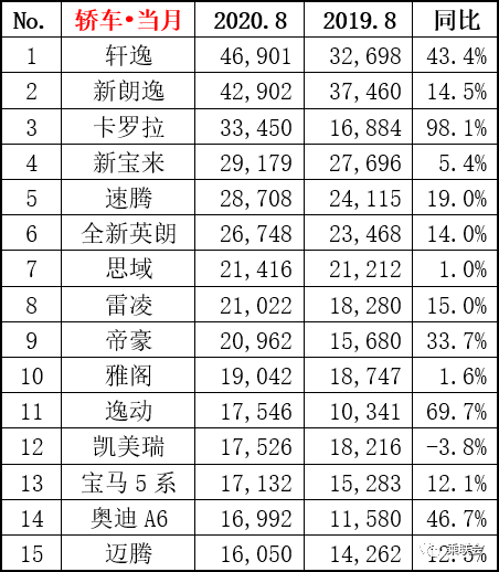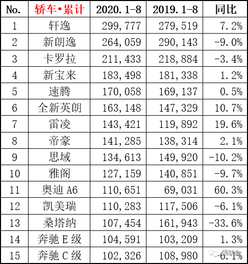 2020年8月汽车销量排行榜(乘联会版)