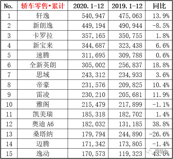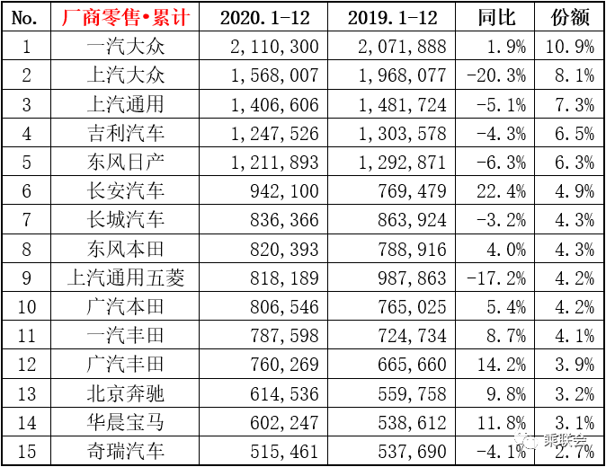 根据乘联会最新数据统计显示,2020年国产狭义乘用车全年批发销量达1976.3万辆,同比下降6.3%。排名前三的是一汽大众、上汽大众和上汽通用。市场的销量超过了预期,体现了行业在连续两年下降后的稳步回升态势。