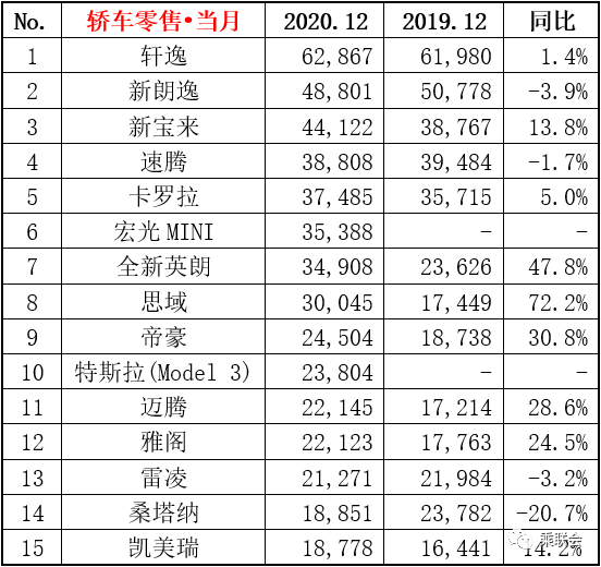 - 12月份新能源狭义乘用车销量20.6万辆,同比增长58.1%,环比增长20.8%;全年累计销量110.9万辆,同比增长9.8%。