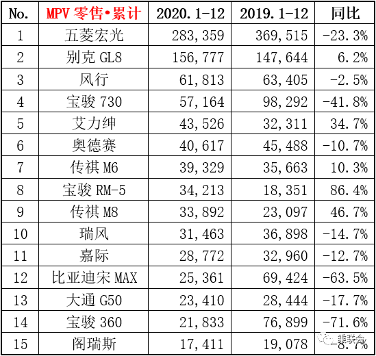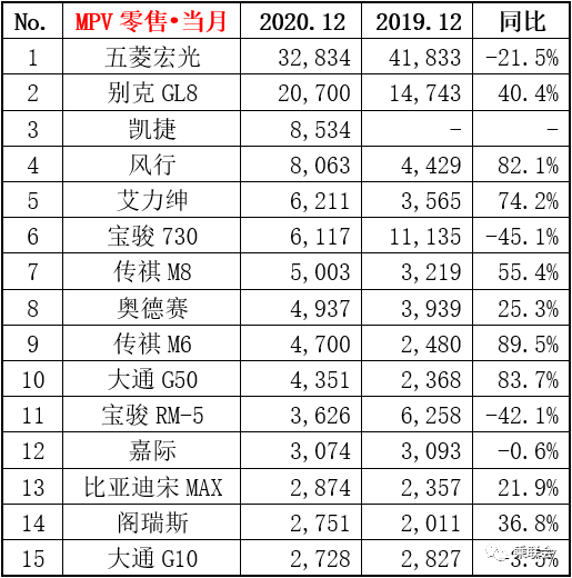 - 12月份MPV销量13.8万辆,同比增长3.8%,环比增长23.2%;全年累计销量109.0万辆,同比下降20.8%。
