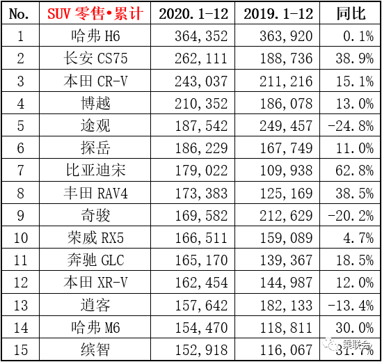 - 12月份SUV销量108.4万辆,同比增长9.0%,环比增长12.5%;全年累计销量894.8万辆,同比下降2.4%。