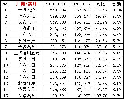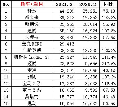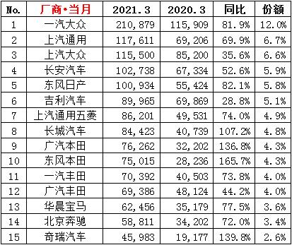 2021年3月及全年汽车销量排行榜(乘联会版)