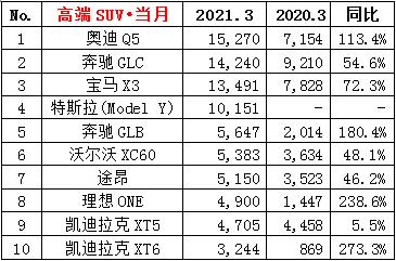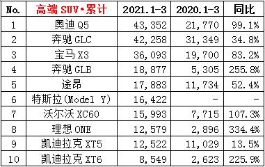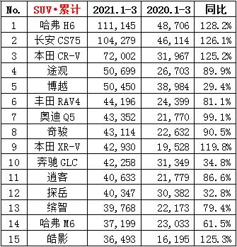 ·3月份SUV销量77.7万辆,同比增长61.7%,环比增长39.6%;累计销量232.0万辆,同比增长67.2%。