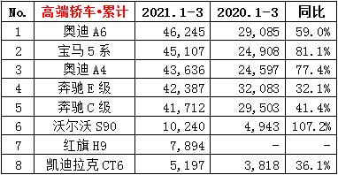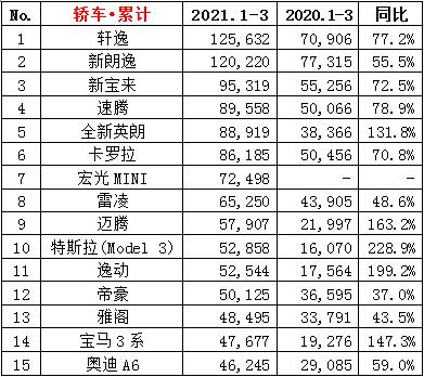 ·3月份轿车销量86.9万辆,同比增长74.2%,环比增长55.6%;累计销量248.8万辆,同比增长72.4%。