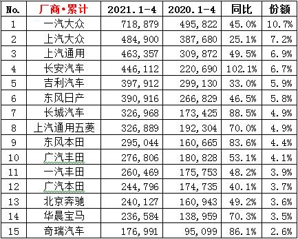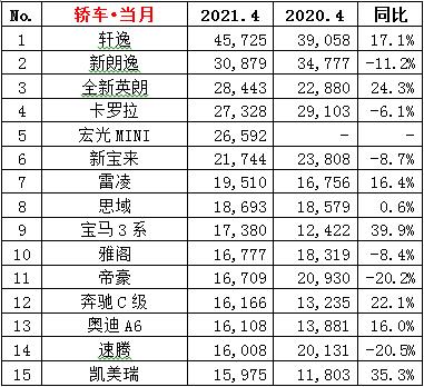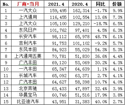 ·4月份市占率分析:在入榜的15家车企中,德系(四家)市占率为24.2%,较上月下降1.3个百分点;日系车(五家)24.0%,较上月提高1.7个百分点;自主品牌 (五家)23.0%,较上月微滑0.3个百分点;美系车(一家)7.3%,比上月增长0.6个百分点;15家合计占有狭义乘用车零售市场的78.5%,比上月增长0.6个百分点。比亚迪汽车今年首次进入榜单。