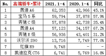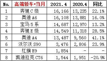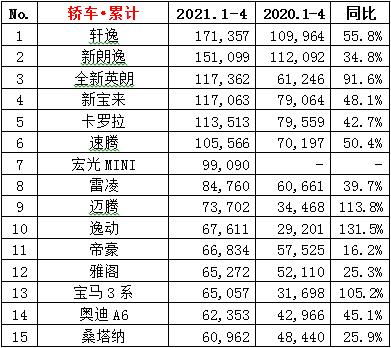 ·4月份轿车销量77.0万辆,同比增长10.9%,环比下降11.4%;累计销量325.8万辆,同比增长52.4%。