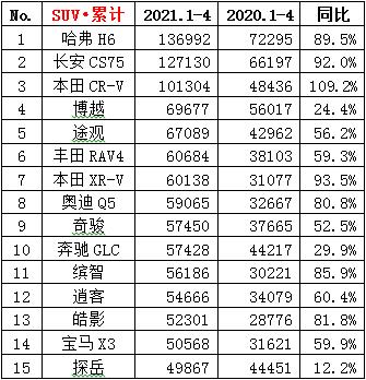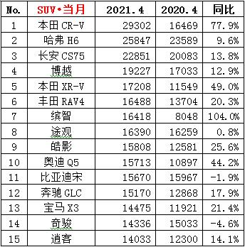 ·4月份SUV销量74.8万辆,同比增长13.0%,环比下降4.0%;累计销量307.0万辆,同比增长49.8%。