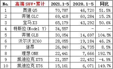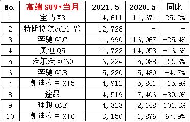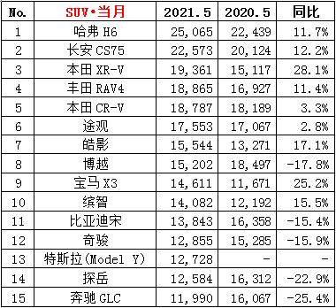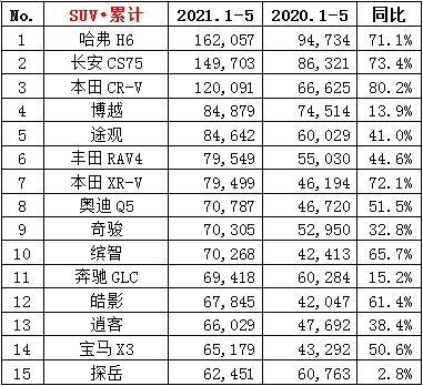 ·5月份SUV销量73.7万辆,同比下降2.3%%,环比下降1.4%;累计销量383.2万辆,同比增长36.7%。