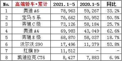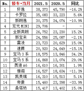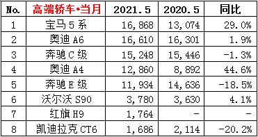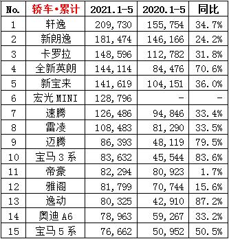 ·5月份轿车销量79.4万辆,同比增长3.3%,环比增长3.4%;累计销量406.2万辆,同比增长39.7%。