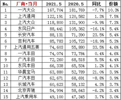 ·5月份企业榜单分析:在入榜的15家车企中,德系车(四家)除个别企业资源受限外,其他几家德系车企环比均有进步,5月市占率为24.9%,较上月提高0.7个百分点;日系车(五家)受芯片等资源的限制,5月市占率为22.4%,较上月下降1.6个百分点;自主品牌(五家)22.0%,较上月微滑1个百分点;美系车(一家)市占率为7.5%,在上月增长的基础上继续攀升0.3个百分点;15家合计占有狭义乘用车零售市场的76.9%,比上月下降1.5个百分点。上汽乘用车今年以来首次入TOP15榜单。