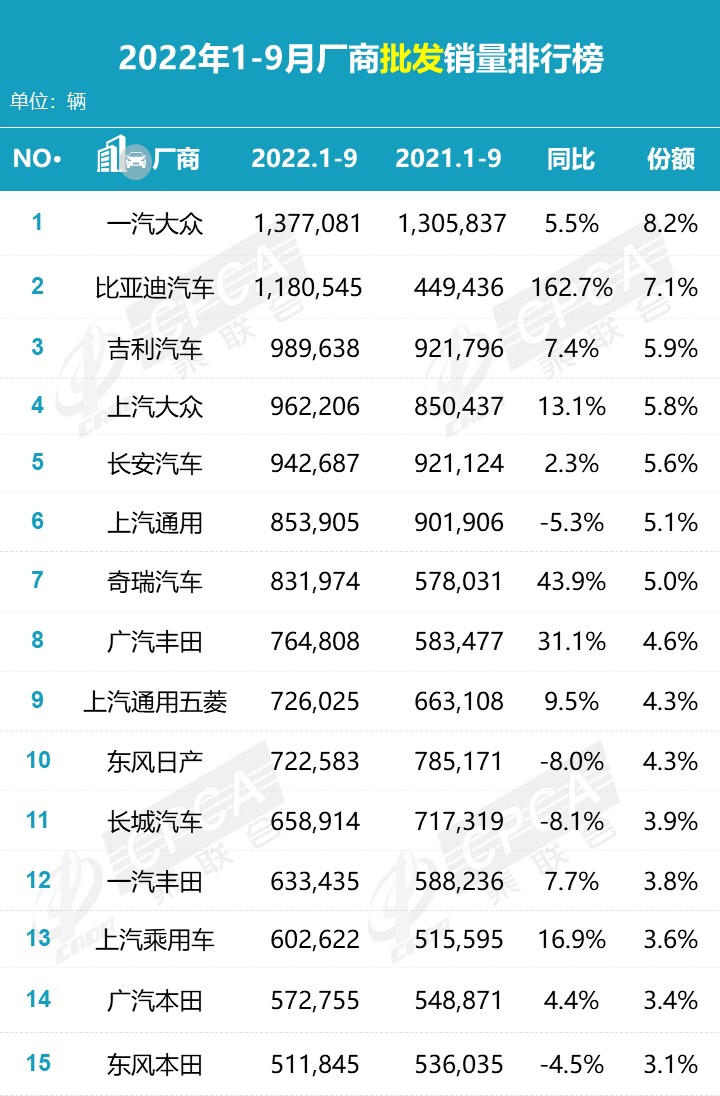 l 9月份轿车销量98.1万辆,同比增长28.2%,环比增长3.4%;累计销量742.3万辆,同比增长5.1%。