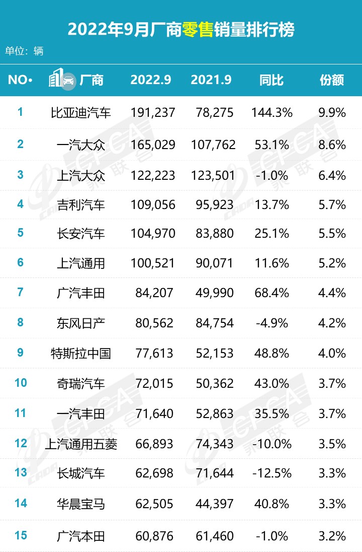据中国汽车流通协会汽车市场研究分会(乘联会)最新零售销量数据统计,9月份国内狭义乘用车市场零售销量达192.2万辆,同比增长21.5%,环比增长2.8%;1-9月份累计销量1487.5万辆,同比增长2.4%。