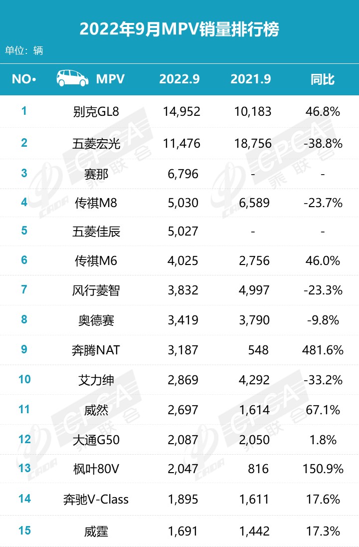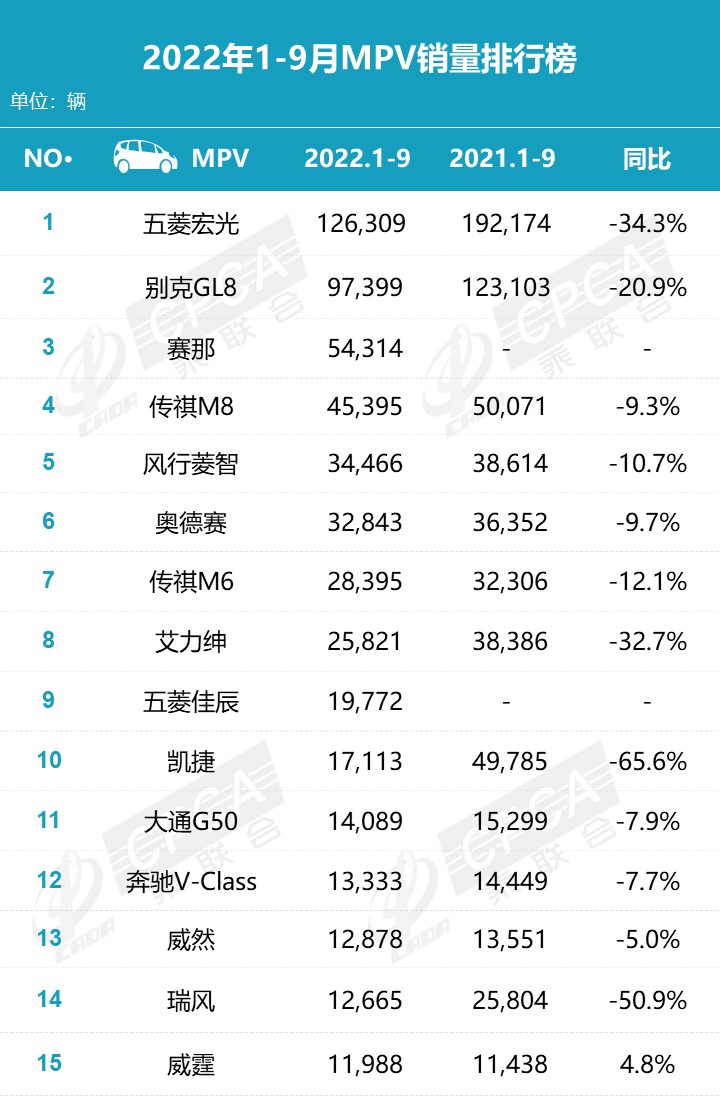 l 9月份MPV销量8.9万辆,同比增长6.4%,环比增长3.8%;累计销量68.8万辆,同比下降15.1%。