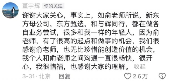 This isn’t the only instance; ever since the small essay incident last year, Yu Minhong seems to have initiated a series of apologies. After apologizing to Dong Yuhui, he then apologized to Dong Yuhui’s fans. He apologized for internal management issues, for the amplification of public opinion, and even for blocking netizens.