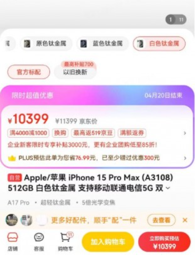 On April 15th, news surfaced that a netizen recently purchased the iPhone 15 Pro Max 512GB version on JD.com for a final price of 10,399 yuan, which is over 1000 yuan cheaper compared to the official price, marking a significant price drop once again.