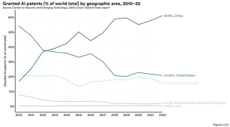 The report reveals that from 2021 to 2022, there was a significant 62.7% increase in global AI patent grants. Since 2010, the number of AI patents granted has grown more than 31 times.