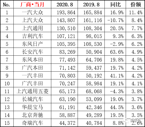 2020年8月汽车厂商销量排行榜 Other / 16 9 月, 2020 排名 汽车厂商 8月销量 1-8月累计 1 一汽大众 193106 1201324 2 上汽大众 145000 2020年8月汽车厂商销量排行榜 Read More »